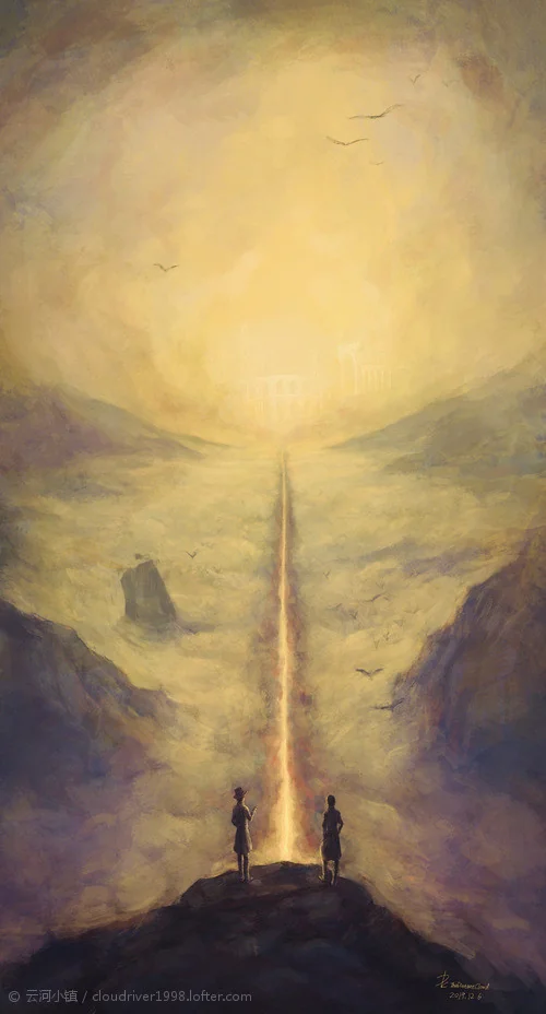 Hence, in between the two mountains, an orange-red light road appeared in the clouds.