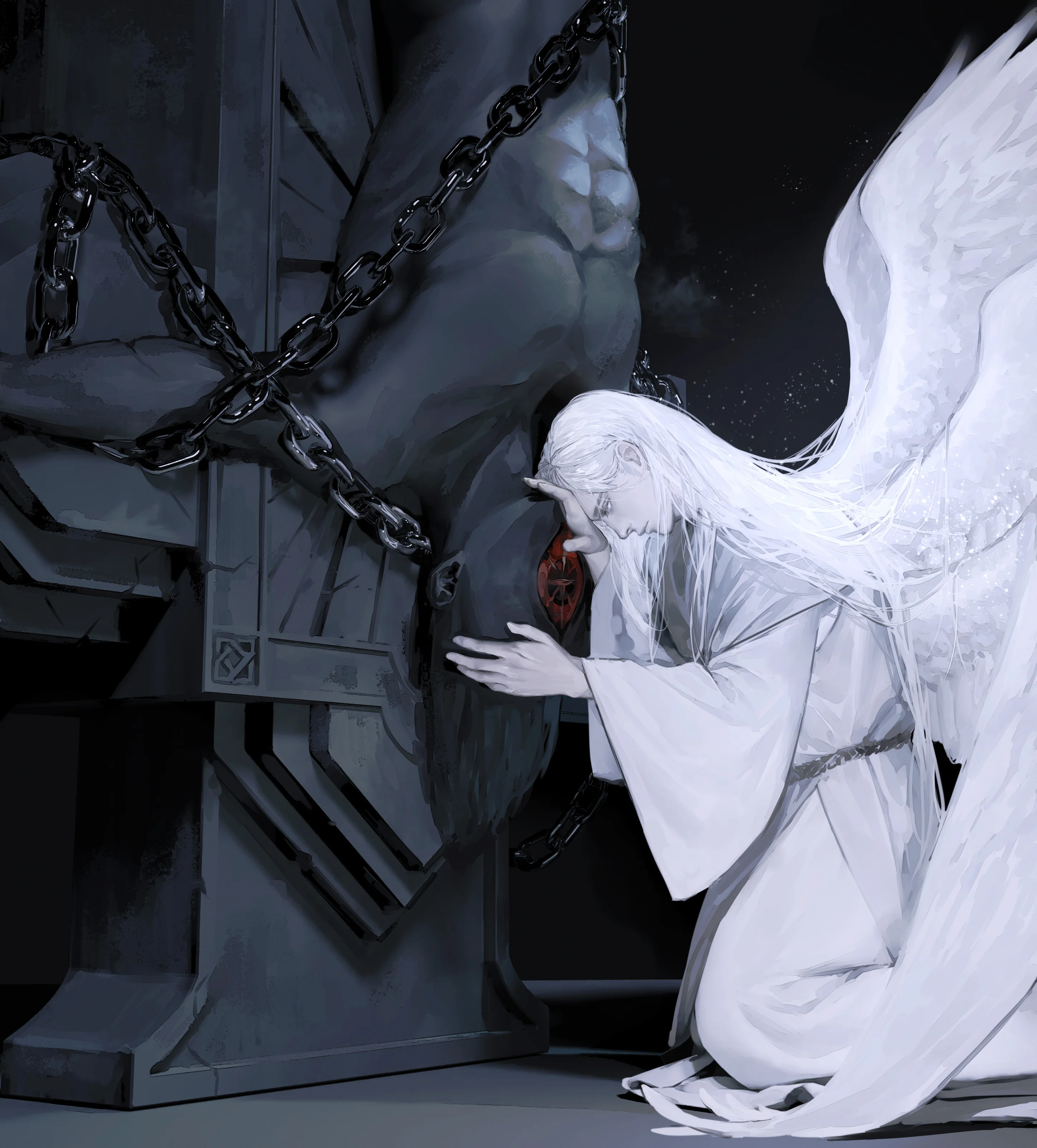 At the bottom of the cross was the Angel of Fate Ouroboros, who was wearing a simple linen robe and had silver hair that reached “His” waist. “He” sat there cross-legged with a gentle and pious expression as “He” closed “His” eyes and prayed.