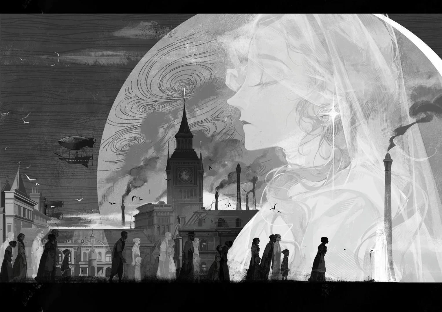 Various scenes in the distance were “drowned,” and even the towering clock tower was only a pale shadow. One by one, workers and poor people felt the discomfort as they fought against the cold, and the disorderly tramps fell one after another in the woman’s wake, their lives as fragile as the bubbles formed during laundry.