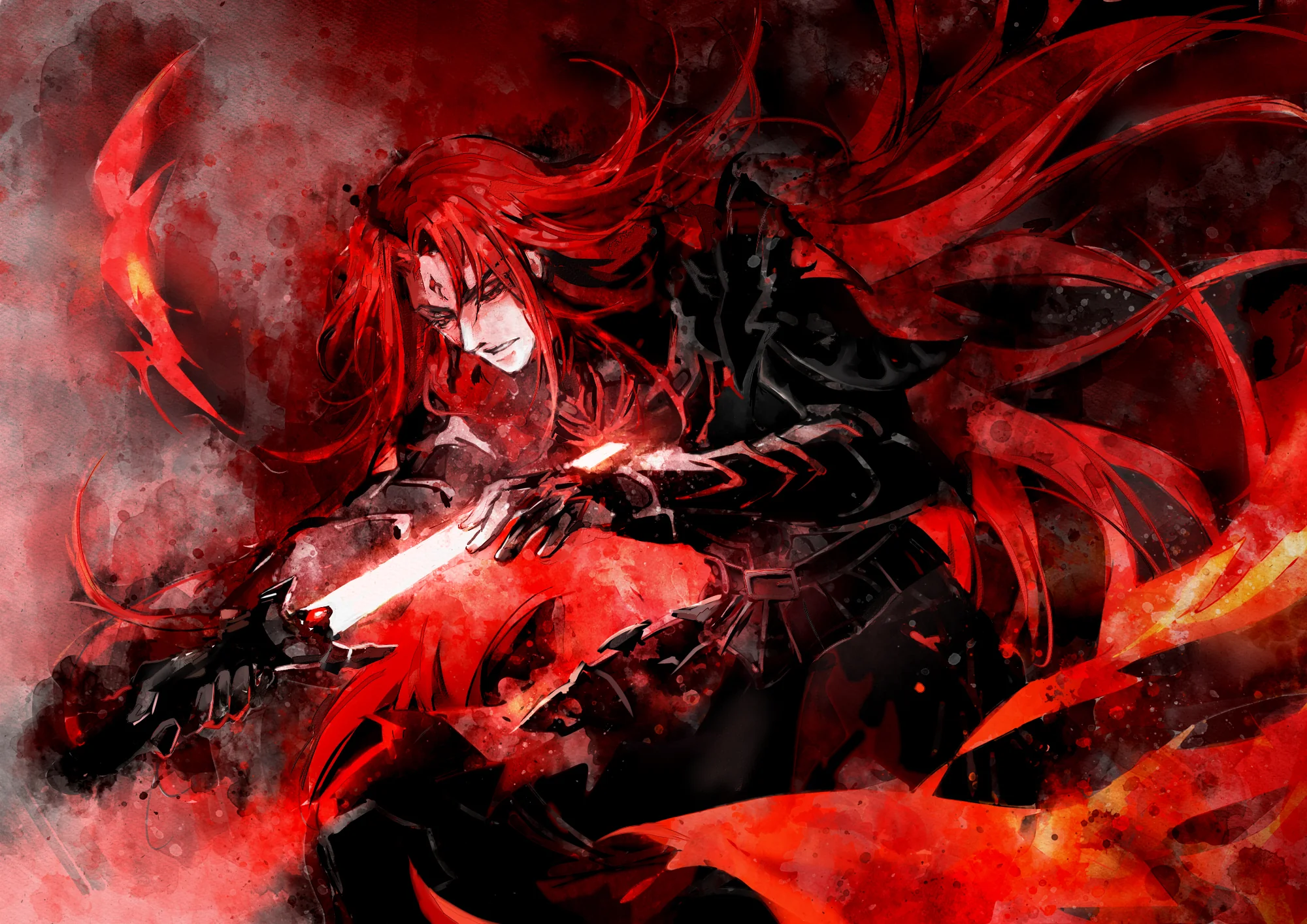 It was a translucent man wearing blood-stained black armor. He was young and handsome with red hair. His face had terrifying signs of decay, and at his glabella was a flag-like mark.